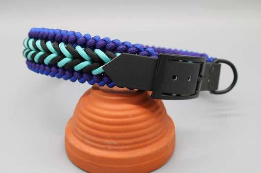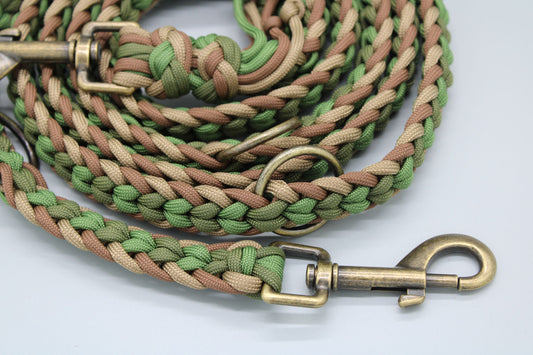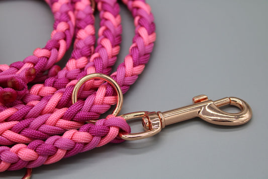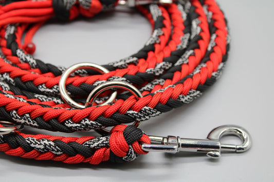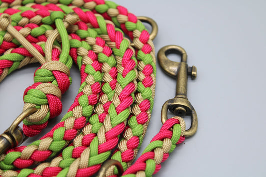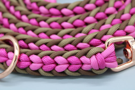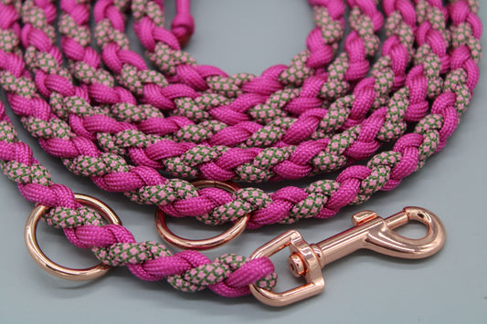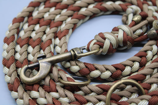 Eine Hundeleine darf natürlich nicht nur hübsch sein, in erster Linie soll sie sicher sein, damit eurem Hund nichts passieren kann. Und dann soll sie auch noch möglichst lange halten und pflegeleicht sein. Bei der Auswahl der Materialien achte ich genau auf solche Dinge. Daher eignet sich Paracord als Material für Hundeleinen auch so gut. Es ist stabil (ein Seil hat eine Bruchlast von 249 kg) und lässt sich einfach reinigen, sollte es einmal schmutzig werden. Karabiner und Ringe werden nach dem Gewicht eures Hundes ausgewählt, damit sie den Belastungen auch lange standhalten.