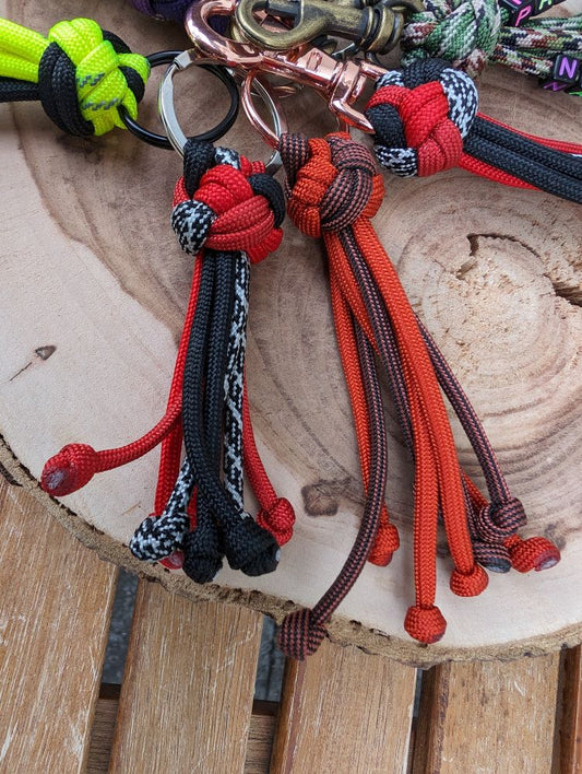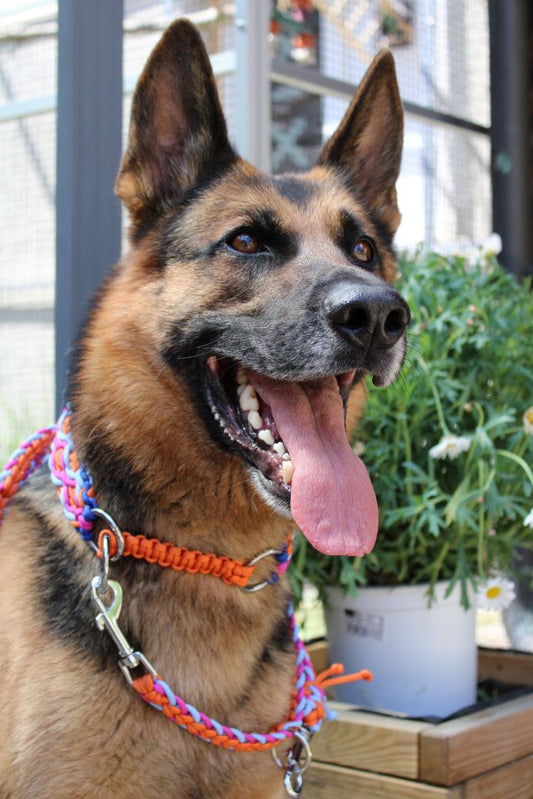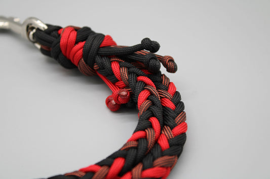 Eine Hundeleine darf natürlich nicht nur hübsch sein, in erster Linie soll sie sicher sein, damit eurem Hund nichts passieren kann. Und dann soll sie auch noch möglichst lange halten und pflegeleicht sein. Bei der Auswahl der Materialien achte ich genau auf solche Dinge. Daher eignet sich Paracord als Material für Hundeleinen auch so gut. Es ist stabil (ein Seil hat eine Bruchlast von 249 kg) und lässt sich einfach reinigen, sollte es einmal schmutzig werden. Karabiner und Ringe werden nach dem Gewicht eures Hundes ausgewählt, damit sie den Belastungen auch lange standhalten.