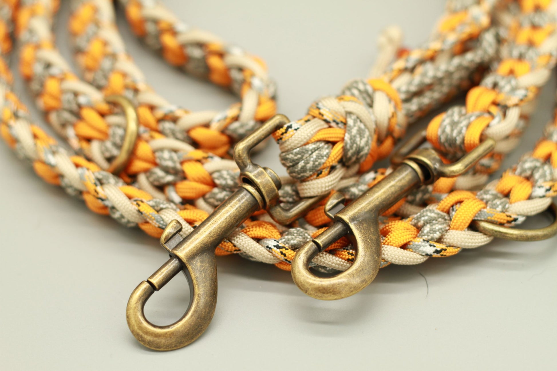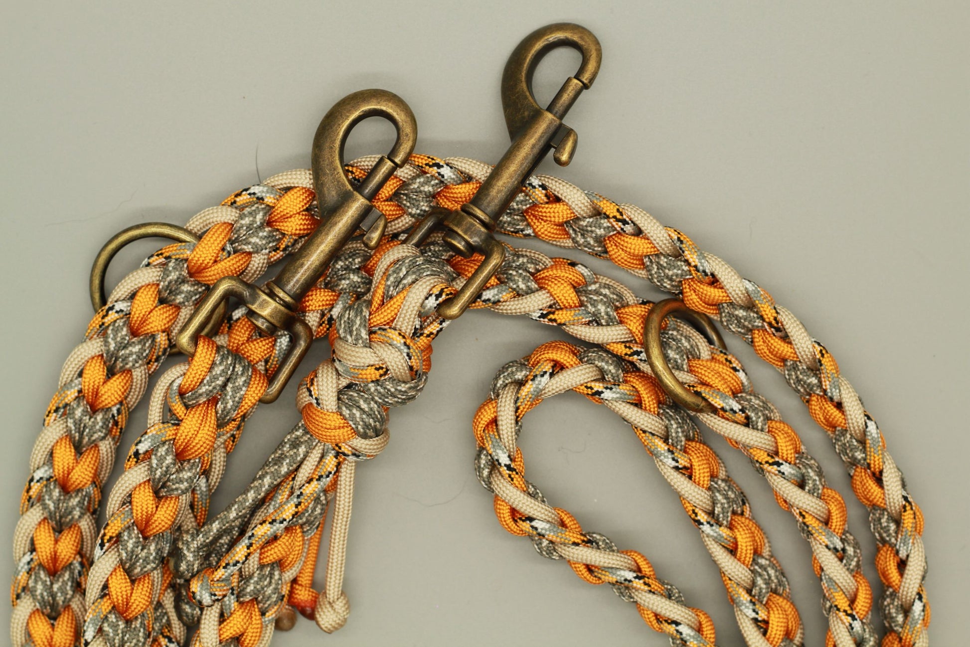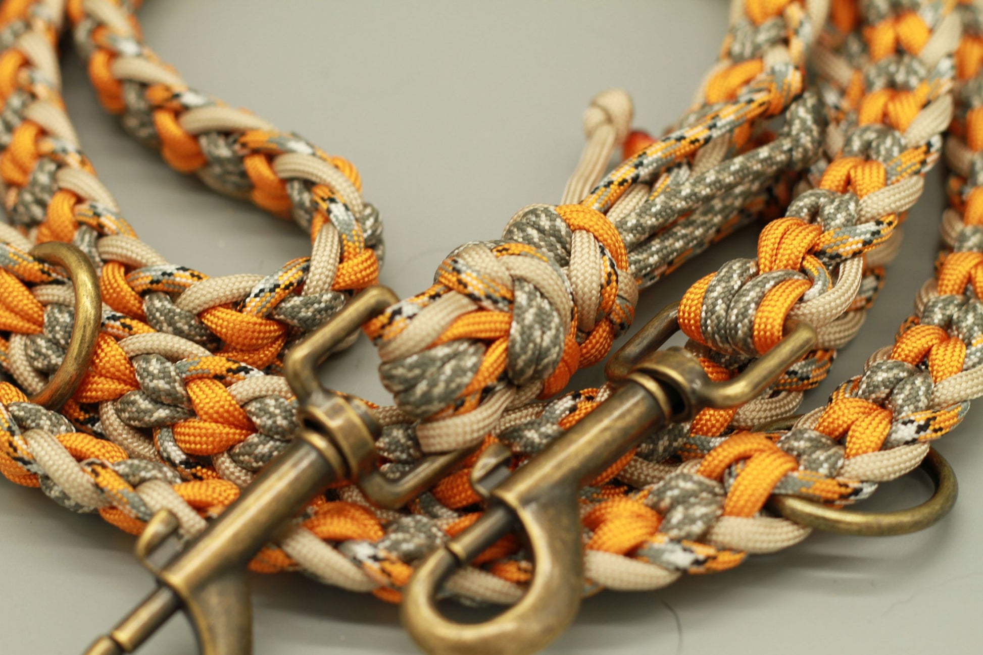 In Handarbeit geflochtene Hundeleine aus stabilen und robusten Paracord in den Farben Orange Camo, Sandfarben und Grau. Passend zu den Farben sind die Karabiner und Ringe in Antik Messing. Die Leine ist flach geflochten und liegt angenehm in der Hand. Paracord ist ein Material aus dem, Outdoorbereich und zeichnet sich durch seine hohe Belastbarkeit aus.